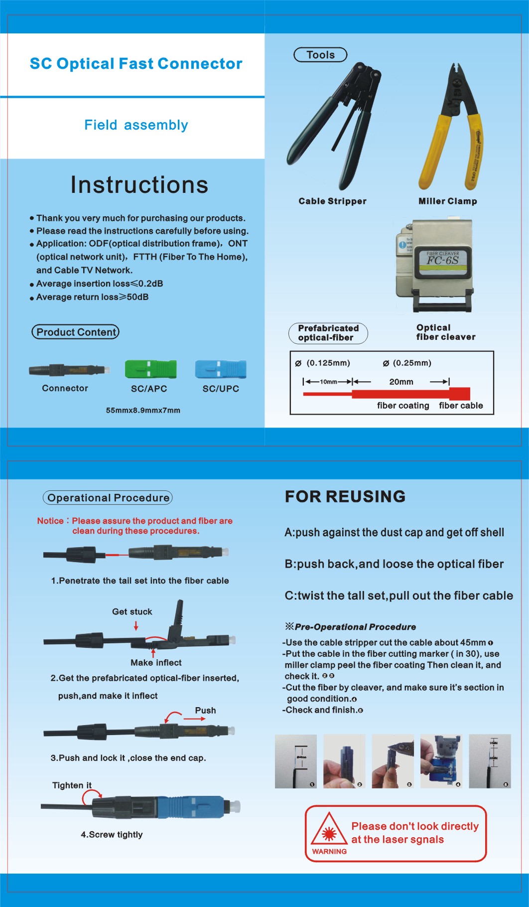 The SC Opitcal Fiber Fast Connector non-preset stub technologies. Precision metallic V-Groove components with co-axial self centering, excellent and durable fixing property. The structure base on unique box-building crimping technology. Preseting the Bending fiber prevent the cable from draging. Integrated protection of the casing to withstand harsh indoor environment. After terminating, both the optical and mechanical performance reach the standard for FTTH.