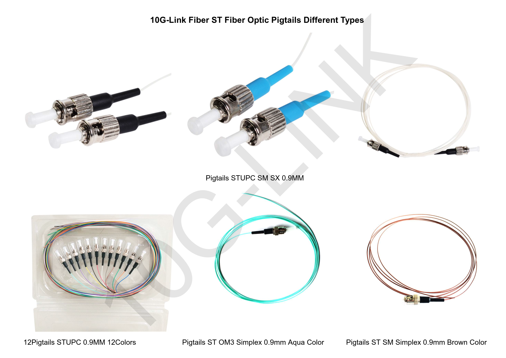 10G-Link Fiber supply LC,SC,FC,ST fiber optic pigtails, with very competitive prices. We offer 3 primary fiber versions including the 9/125um single mode, 62.5/125 multimode and 50um OM3 10Gb types, These fiber pigtails are with premium grade connectors and with typical 0.9mm outer diameter cables. Simplex fiber pigtail and duplex fiber pigtails are available, with different cable color, cable diameter and jacket types optional.