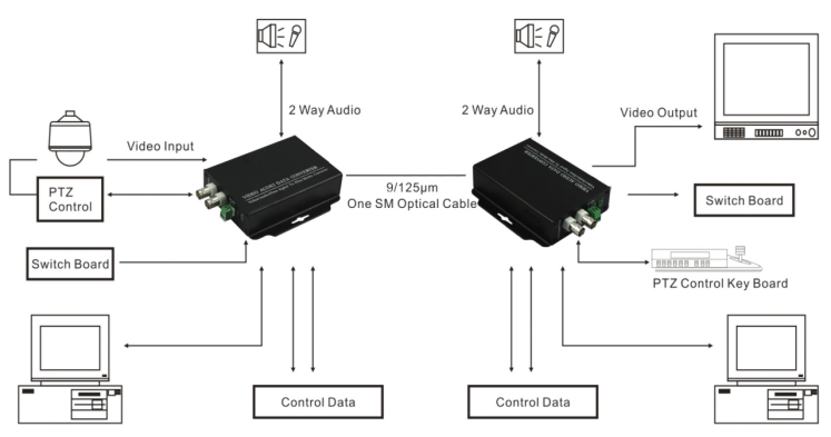Digital fiber optic video transceivers can simultaneously transmit 1-128 channels of 8-bit or 10-bit digitally encoded video/return or bidirectional data/unidirectional or bidirectional audio/Ethernet/Telephone/Binary input/output over one multimode or single-mode optical fiber. These multiplexers are typically used in applications where the cameras have P/T/Z capabilities. Plug and Play design ensures the ease of installation and operation. Electronic and optical adjustments are never required. LED indicators are provided for instantly monitoring system status. Devices are available for either standalone or rack-mount installation, which is suitable for different working environment.