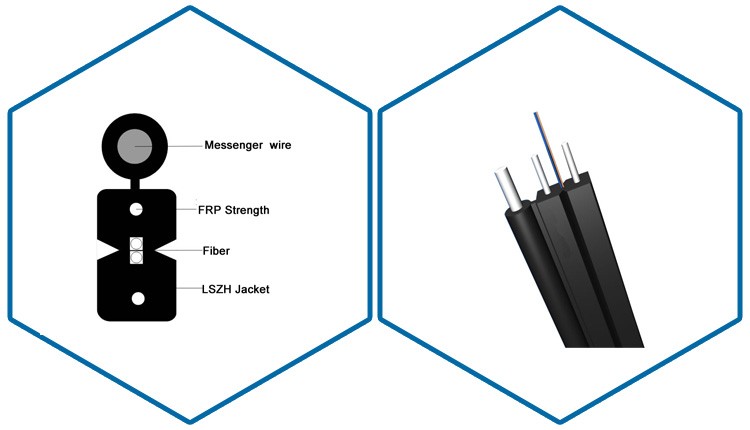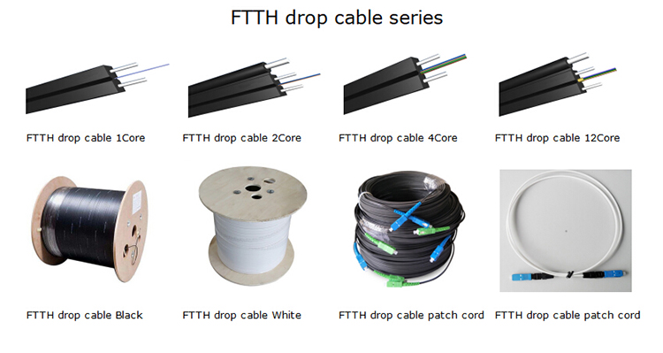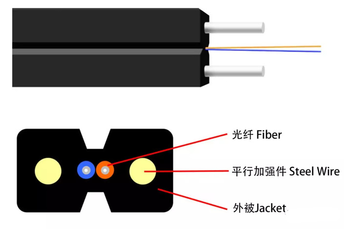 Bow Type Drop Cable Structure: optical fiber(s) is placed between two steel wire strength members, with self-supporting steel wire strength component, low smoke, non-halogen flame retardant outer sheath material.we supply 1 -6 core FTTH fiber optic cable.