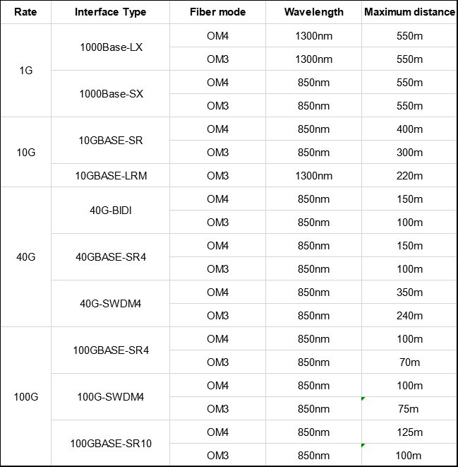 10 Gigabit Ethernet: up to 33 meters at 850nm, up to 300 meters at 1300nm