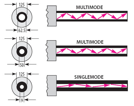 Single Mode fiber is usually 9/125 in construction. This means that the core to cladding diameter ratio is 9 microns to 125 microns.Single Mode fiber optic cable has a small diametral core that allows only one mode of light to propagate. Because of this, the number of light reflections created as the light passes through the core decreases, lowering attenuation and creating the ability for the signal to travel further. This application is typically used in long distance, higher bandwidth runs by Telcos, CATV companies, and Colleges and Universities.