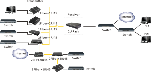 ●Connection between fiber to copper 10Gbps Ethernet equipment function as fiber-to-copper media converter for long distance transmission