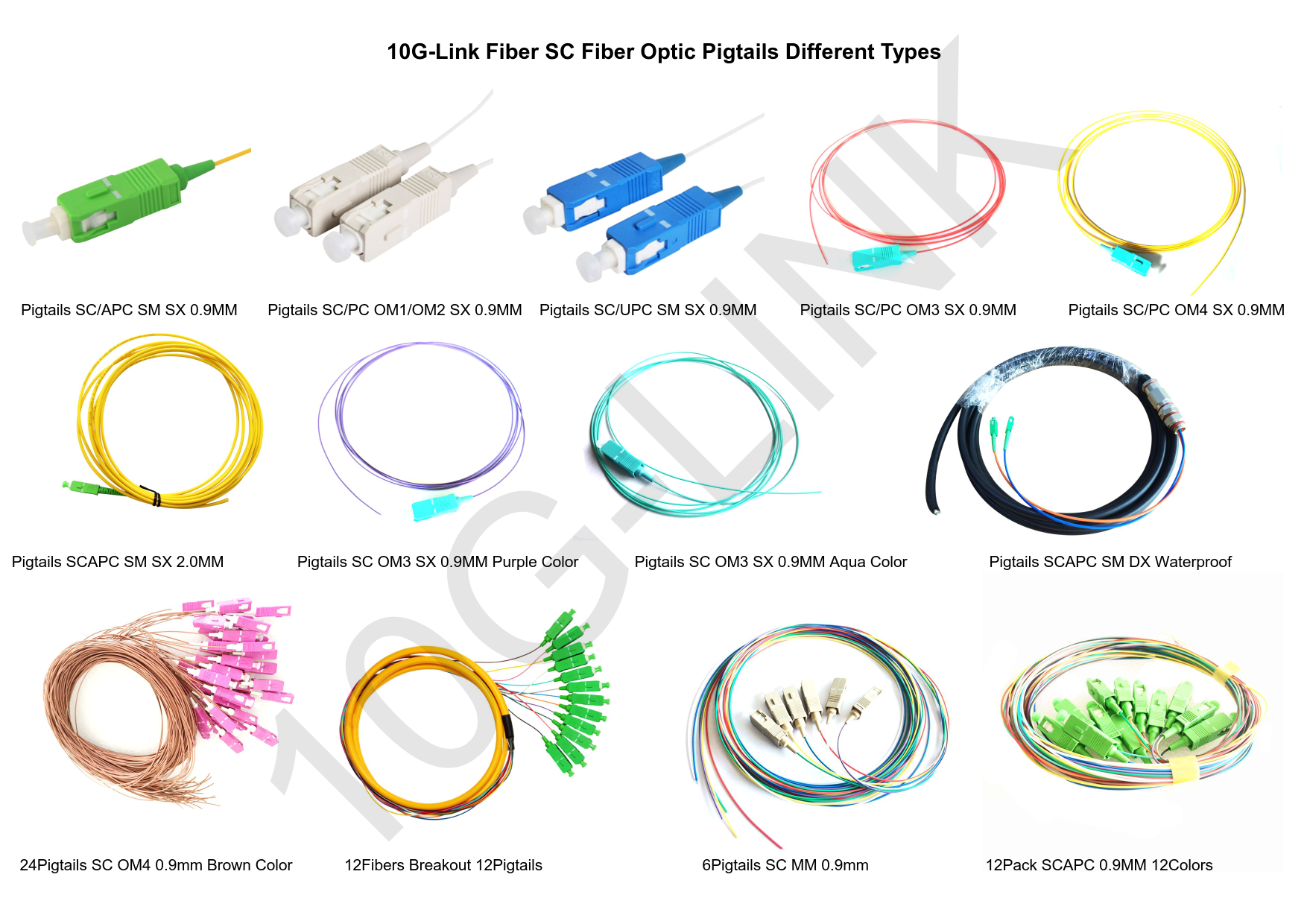 10G-Link Fiber supply LC,SC,FC,ST fiber optic pigtails, with very competitive prices.  We offer 3 primary fiber versions including the 9/125um single mode, 62.5/125 multimode and 50um OM3 10Gb types, These fiber pigtails are with premium grade connectors and with typical 0.9mm outer diameter cables. Simplex fiber pigtail and duplex fiber pigtails are available, with different cable color, cable diameter and jacket types optional.